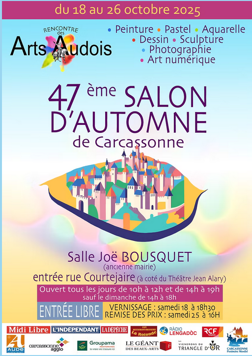 Salle Joë Bousquet Entrée rue Courtejaire à Carcassonne ​ Horaires et jours d’ouverture : Du lundi au samedi : de 10h à 12h et de 14h à 19h Dimanches : de 14h à 18h. ​ Remise des Prix le Samedi 25 octobre 2025 à 16h