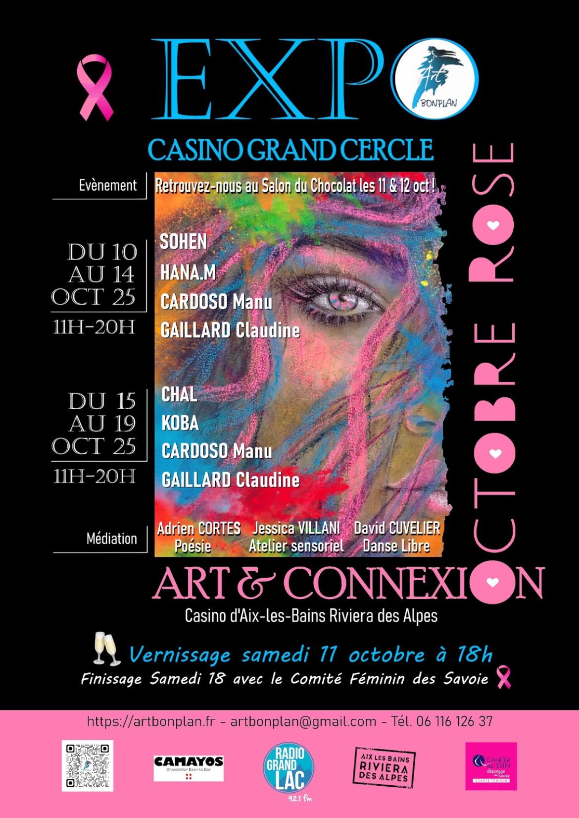 Octobre sera rose et gourmand pour 6 artistes plasticiens qui vous invitent à se connecter à soi, à la nature et à l'univers. L'exposition débute avec le thème très attendu Salon du chocolat et de la gourmandise et se poursuit avec le bien être. Laissez-vous embarquer dans des univers originaux , explorez, ressentez et exprimez vos sensations avec des artistes accessibles et sympas! 2 Intervenants se joignent à nous pour vous proposer respectivement une approche poétique de la beauté qui nous entoure et l'autre par le mouvement, en exprimant nos sensation avec le corps en dansant un tableau.Infos ou billetterie :