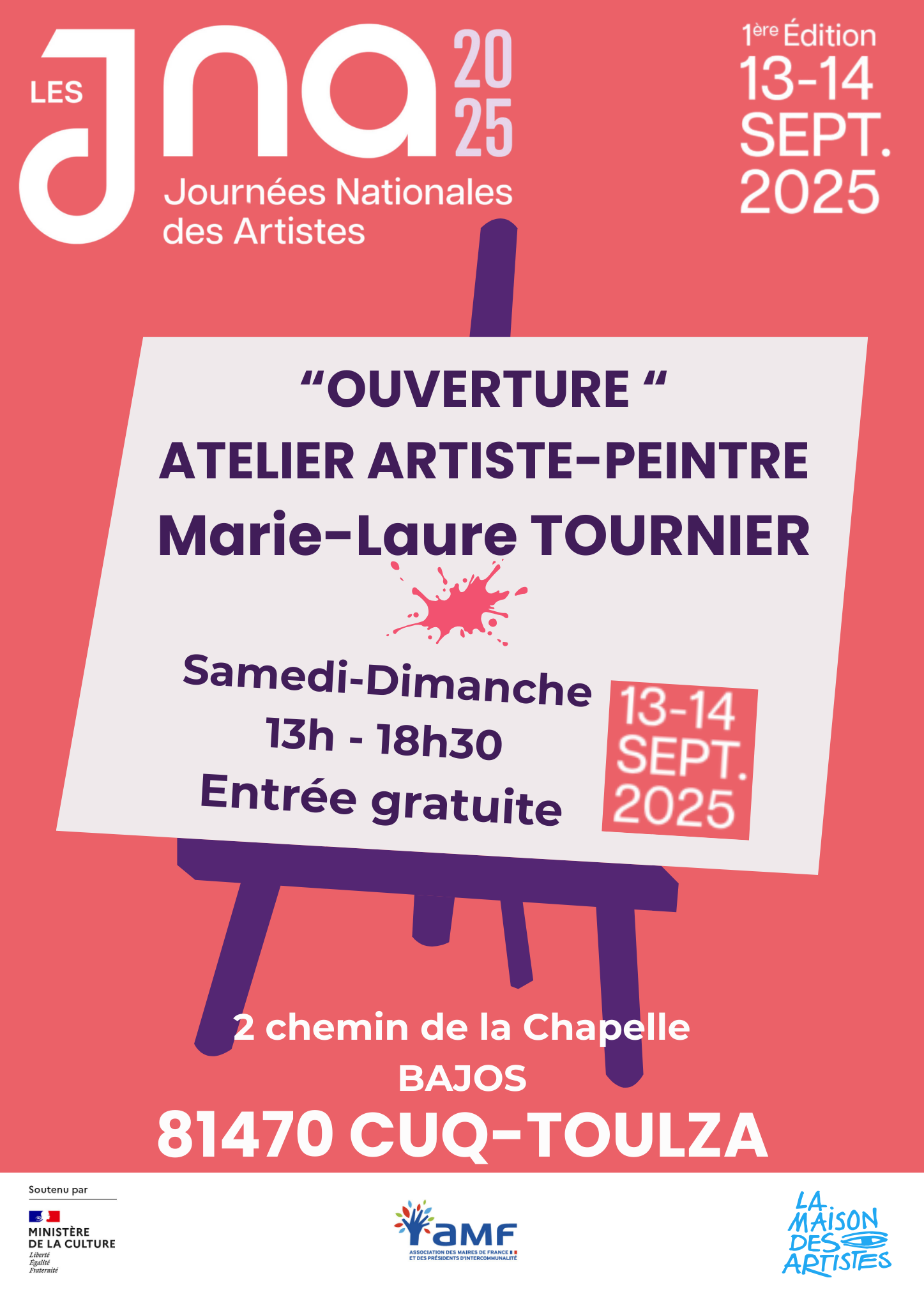 Pour la 1ère fois, Marie-Laure TOURNIER ouvre au grand public son atelier d'artiste peintre pour les JNA 2025 ! A Cuq-Toulza, entre Castres (Tarn) et Toulouse (Haute-Garonne), les JNA rayonneront avec cette ouverture d'atelier peintre ! Ouverture de l'atelier et exposition samedi 13 et dimanche 14 septembre de 13h à 18h30. Une occasion unique de rencontrer l'artiste et de découvrir ses créations dans la plus totale simplicité. Convivialité garantie ! Les JNA (Journées Nationales des Artistes) sont une initiative de la Maison des Artistes (MDA). Parrainées par la ministre de la Culture et en partenariat avec l'AMF (Association des Maires de France), cette 1ère édition doit favoriser un contact vivant sur tout le territoire ! L'artiste répond à cet appel national !