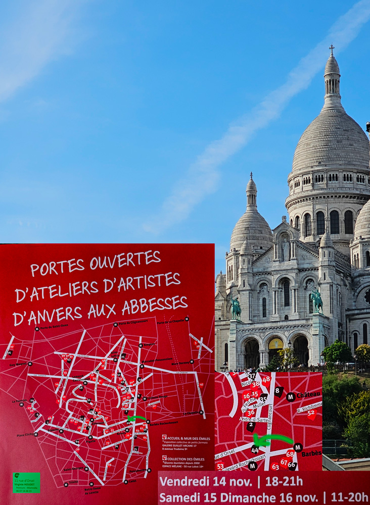 Au pied de la butte montmartre, les artistes ouvrent leur atelier . le Vendredi 14 de 18 à 21h et les Samedi 15 et dimanche 16 de 11h à 20h. Dans la liste, je suis le n°44 au 11 rue d'Orsel. Vous y verrez gouaches, encres et cyanotypes.Infos ou billetterie : https://www.virginiehoudet.com