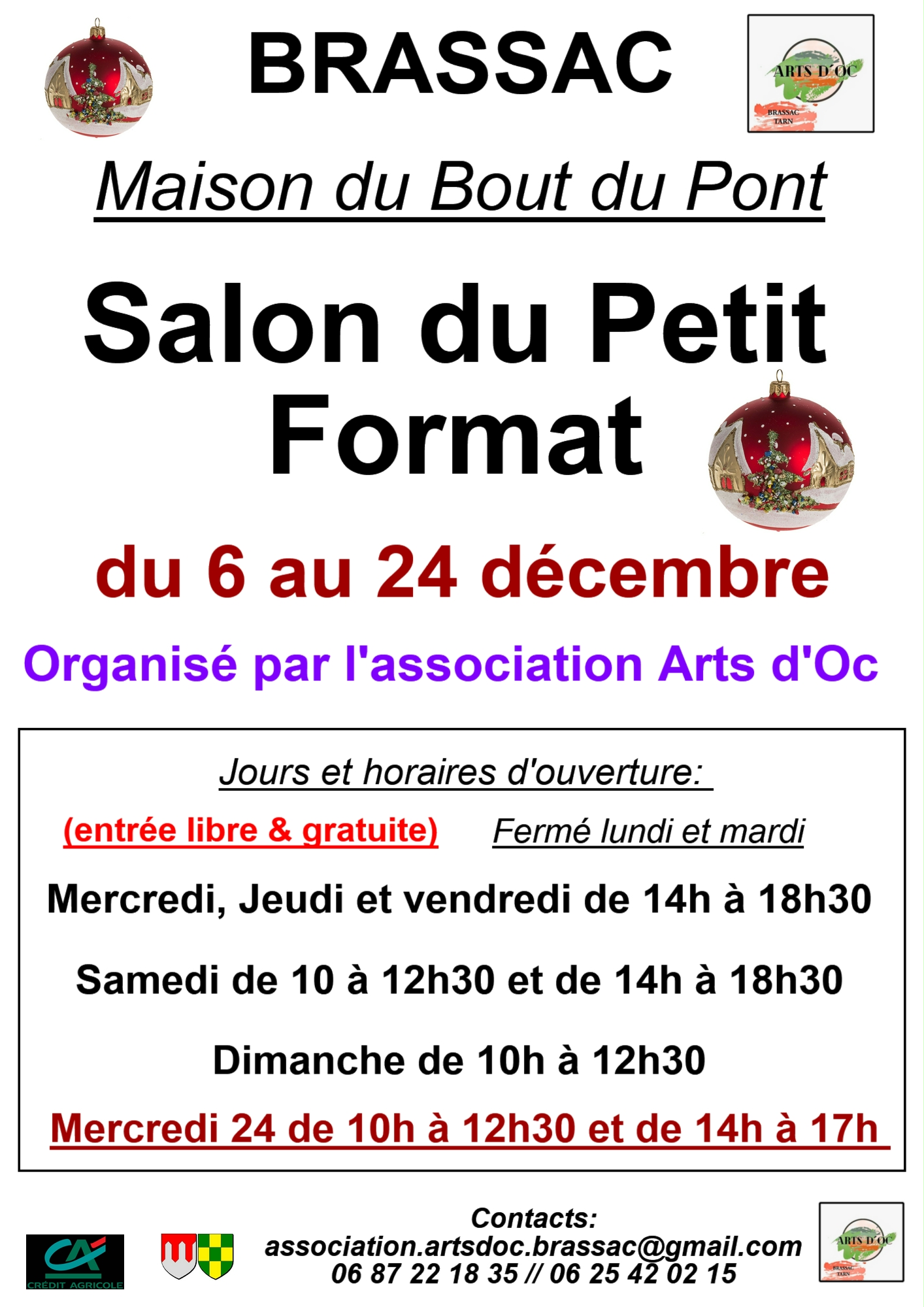 Préparez Noël et retrouvez une partie de mes œuvres à Brassac (Tarn) du 6 au 24 décembre 2025. Je présente 7 petits tableaux au format 30x20 cm, une série de ma collection "Marines , au Salon du petit format organisé par l'association Art d'Oc. Vous trouverez dans ce salon des idées de cadeaux de Noël pour tous les budgets avec des objets de créateurs, sculptures, peintures, etc... Le salon, c'est du 6 au 24 décembre 2025 : LIEU : 1 PLACE SAINT-BLAISE (MAISON DU BOUT DU PONT) à BRASSAC (81260) HORAIRES : MERCREDI-JEUDI-VENDREDI : 14H à 18H30 SAMEDI : 10H-12H30 / 14H-18H30 DIMANCHE : 10H-12HJ30 (fermé le lundi et le mardi) Entrée gratuite / Vernissage samedi 6 décembre à 18hInfos ou billetterie :